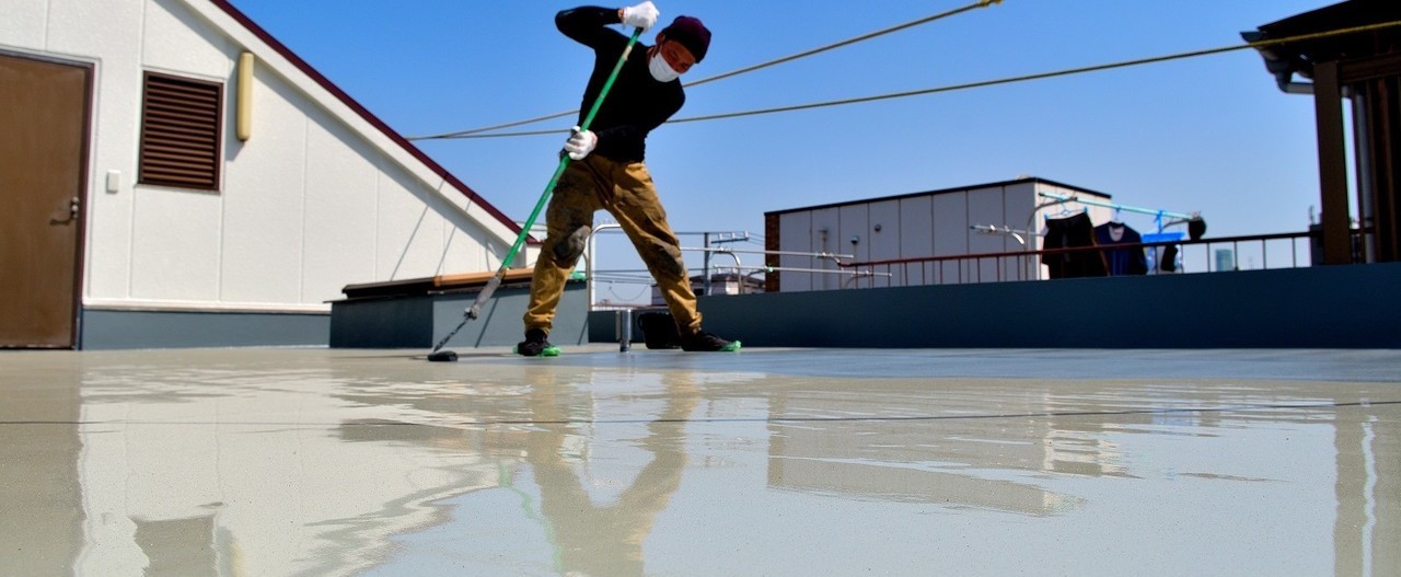 築年数が20年にあるなる、現況FRP防水のトップコート改修工事の塗装工程です。