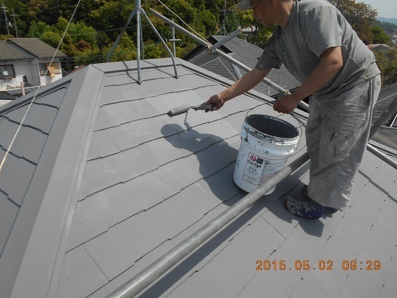 兵庫県宝塚市山本中でサイディング外壁・カラーベスト屋根に日進産業の遮熱・断熱塗料の「ガイナ」塗装施工例です。サイディング外壁のボード継ぎ目のコーキングの劣化が激しく、内部の青いボンドブレーカーが見えている箇所もありました。まづ、足場施工後このコーキング部分をキッチリと施工します。ガイナ塗装色は、屋根N-50 外壁22-85C 19-65Dで仕上げています。