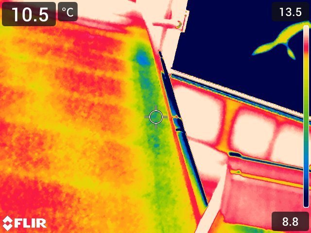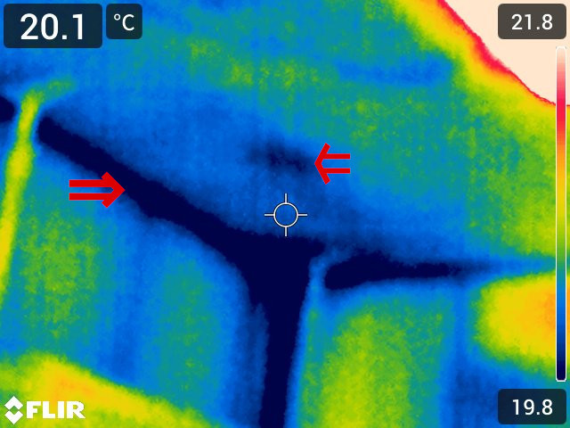 この温度分布を読み取ることで雨漏り箇所を発見します。