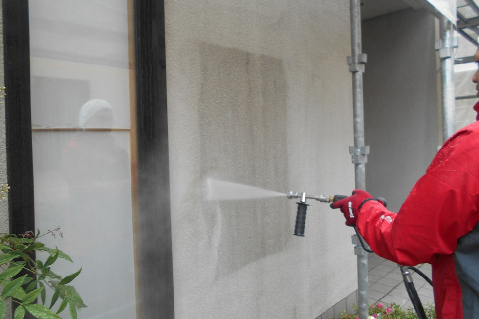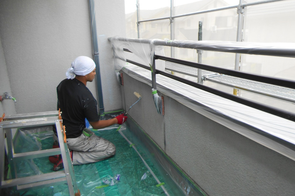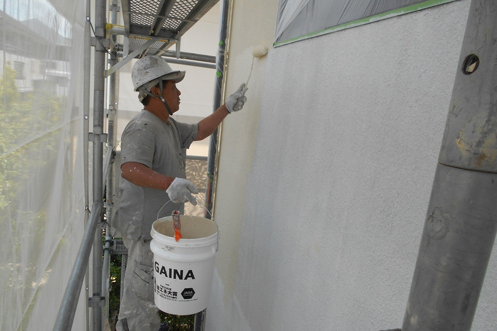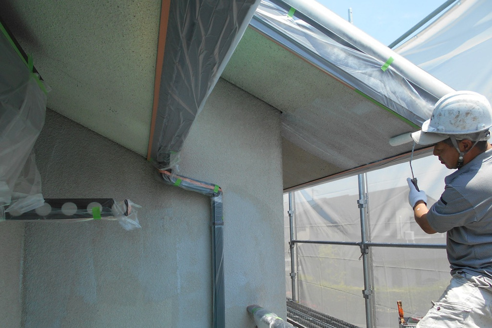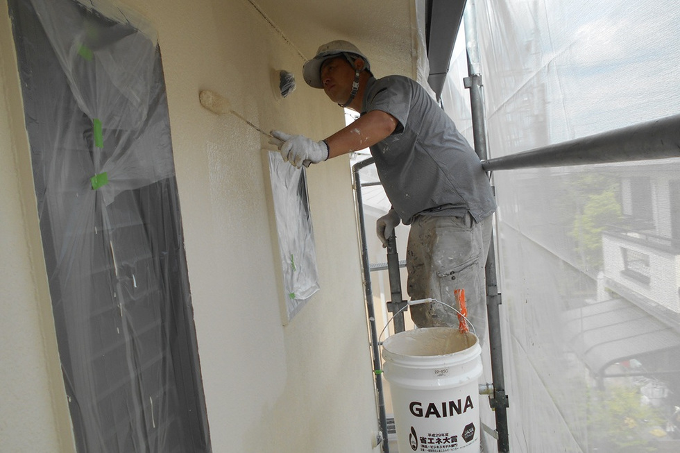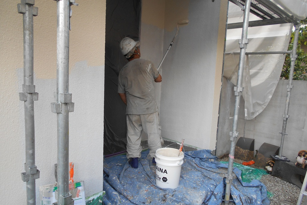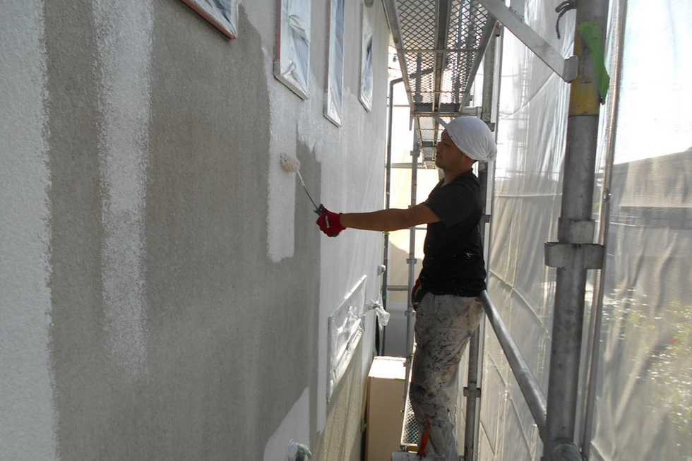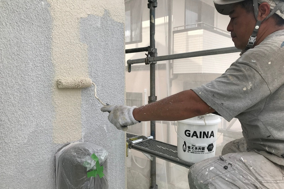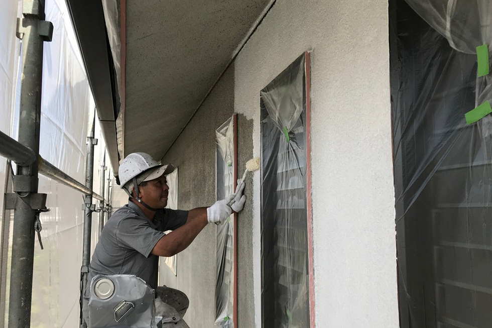 吸い込みと凹凸が大きいスタッコ外壁の為下塗りを2回塗装、上塗りを2回で合計4回塗装で仕上げています。